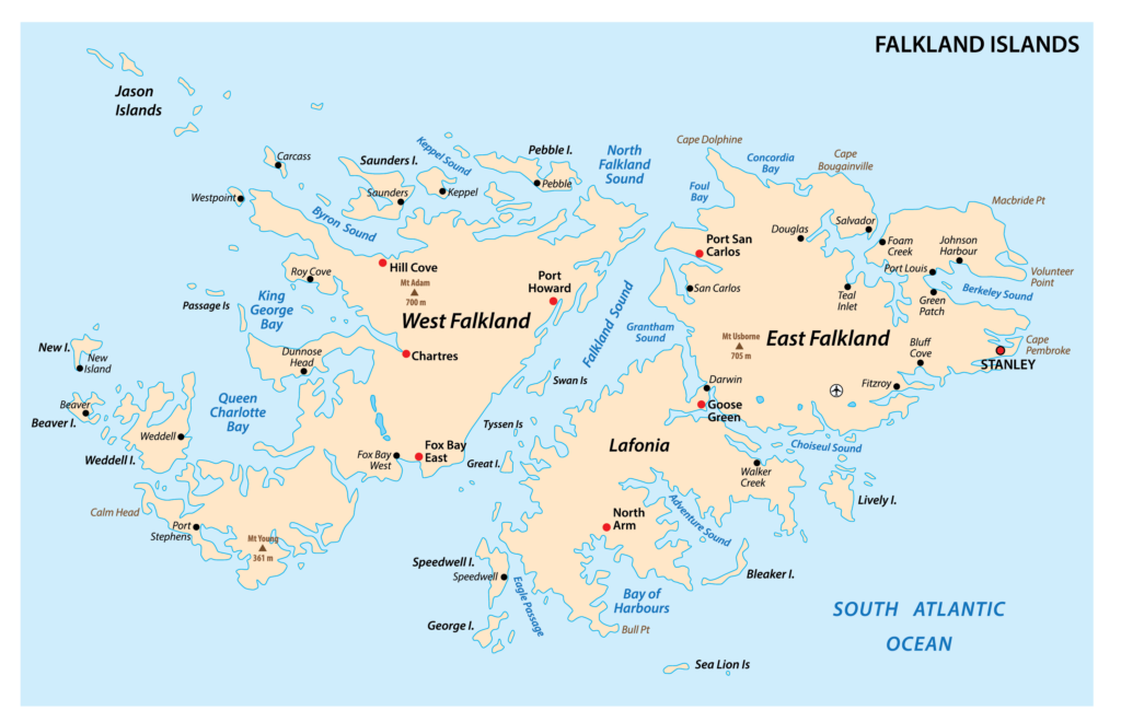 With East Falkland and West Falkland as the main ones. East Falkland hosts the capital, Stanley, and most of the population. Both main islands and several smaller ones offer visitor accommodation and cruise excursions.