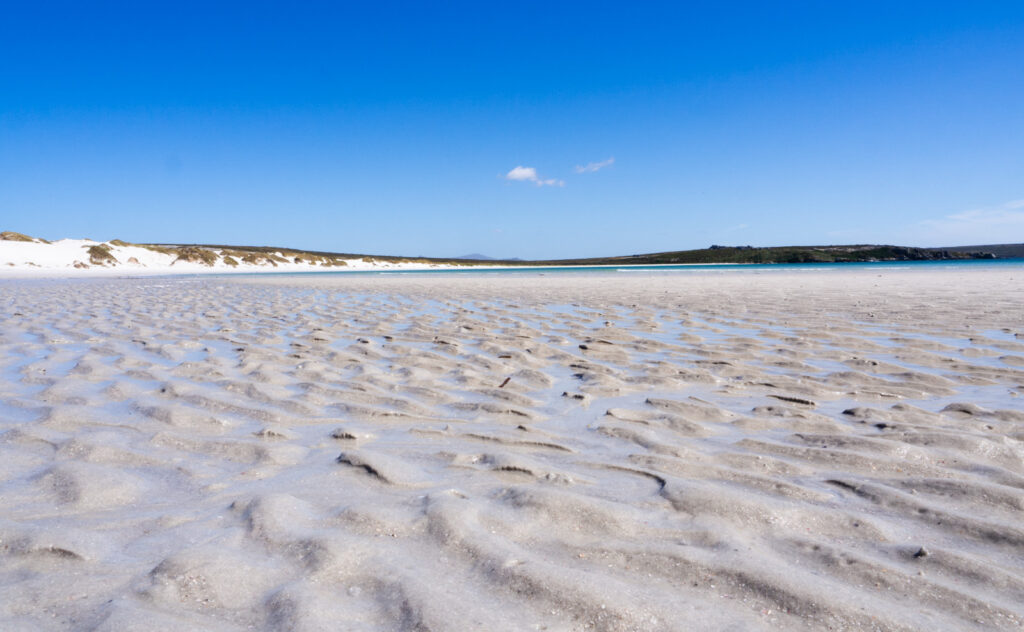 Strong westerly winds influence conditions, making the west drier and sunnier than the east, where higher rainfall supports ferns and tussac grass. Annual sunshine averages over 1,700 hours, similar to southern England, and summer days are often windy, bright, and clear.